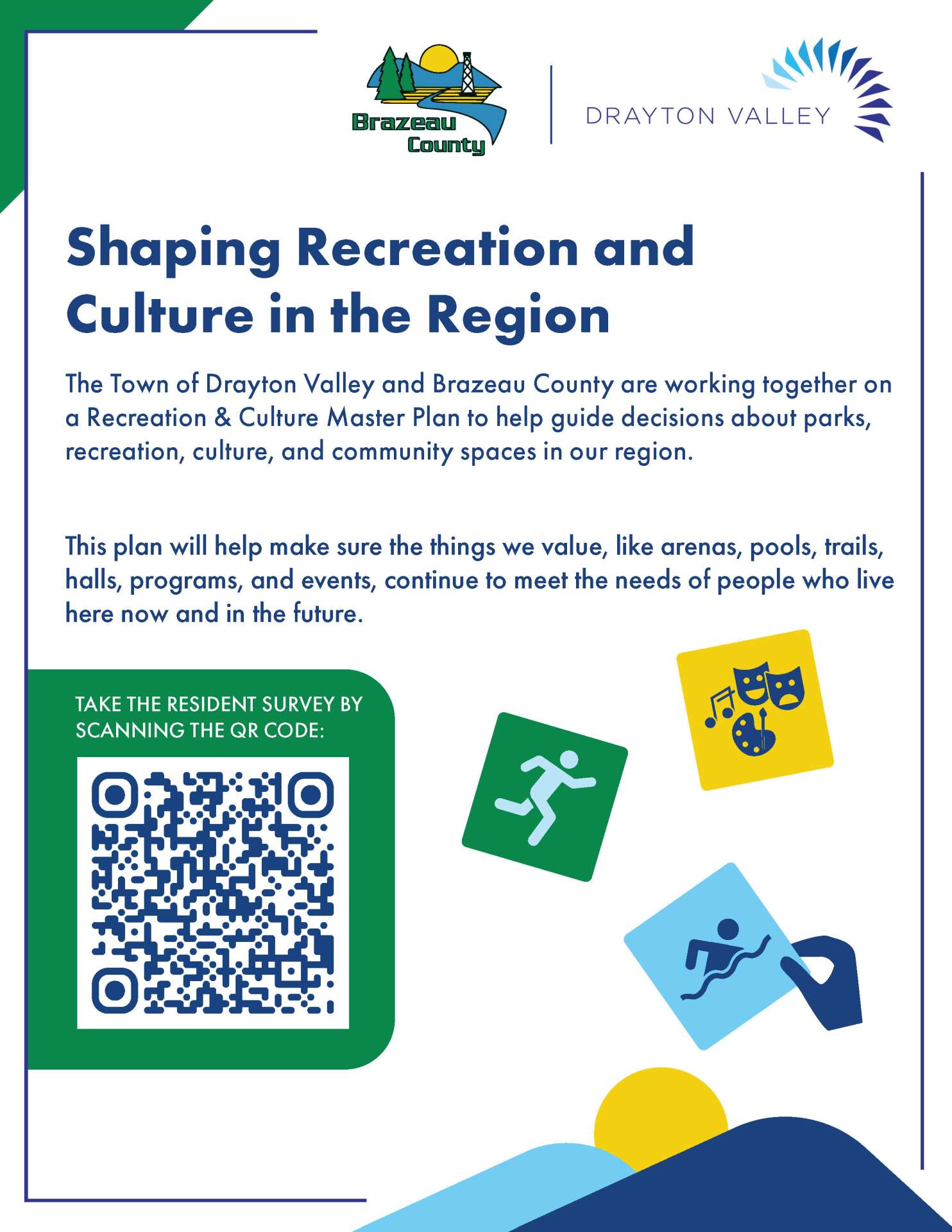 The Town of Drayton Valley and Brazeau County are working together on a Recreation & Culture Master Plan to help guide decisions about parks, recreation, culture, and community spaces in our region.
