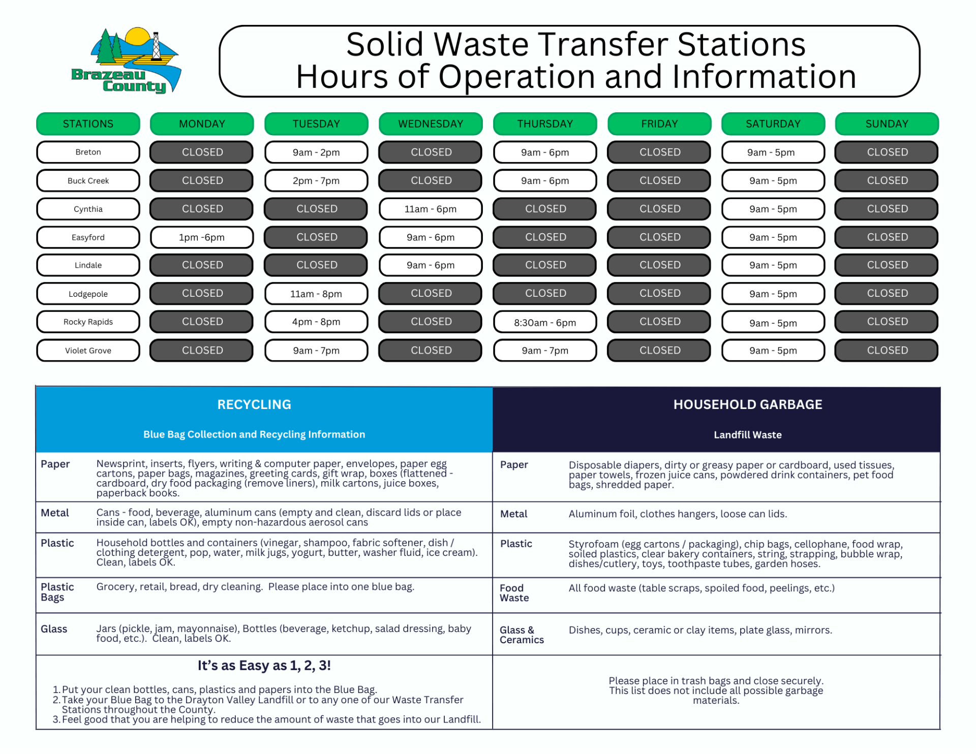 Waste Transfer Stations are located at Breton, Buck Creek, Cynthia, Easyford, Lindale, Lodgepole, Rocky Rapids, and Violet Grove.